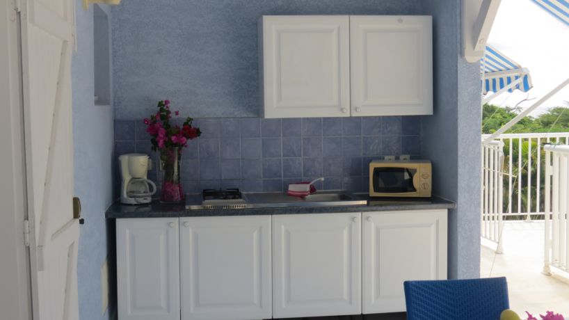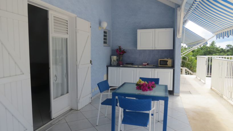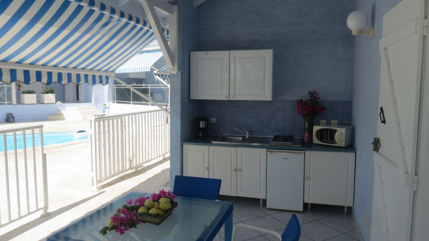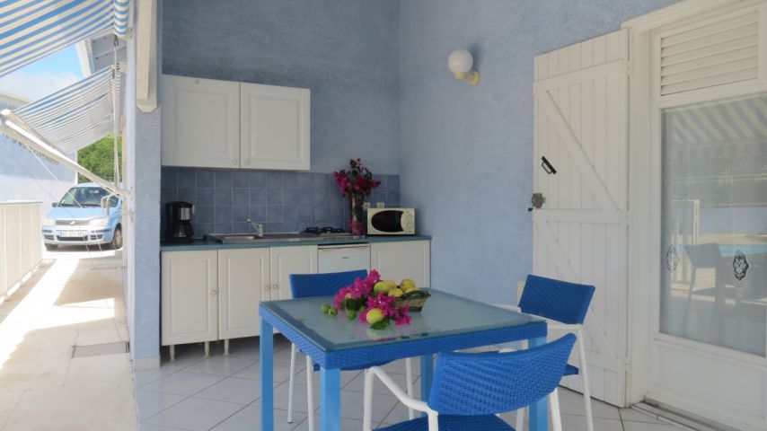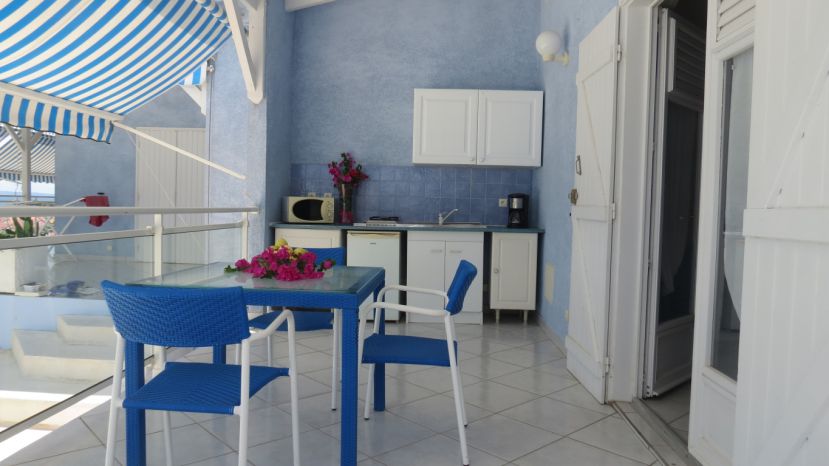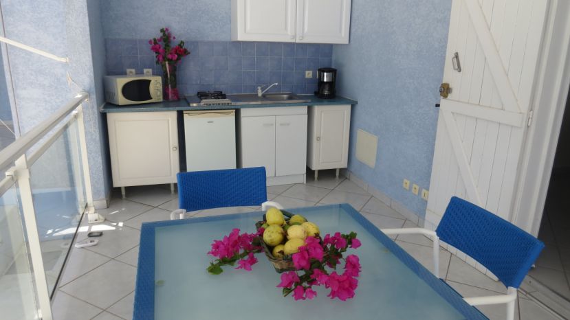 Cuisine sur terrasse (15m²) : table + 4 chaises + frigo/congélateur